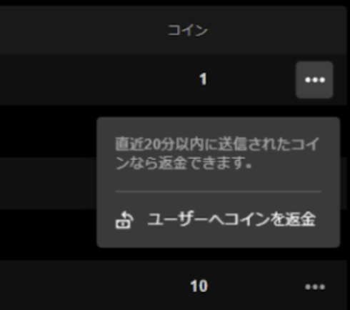 返金可能な場合は、収益・チップ履歴に返金に関する操作項目が表示されます。